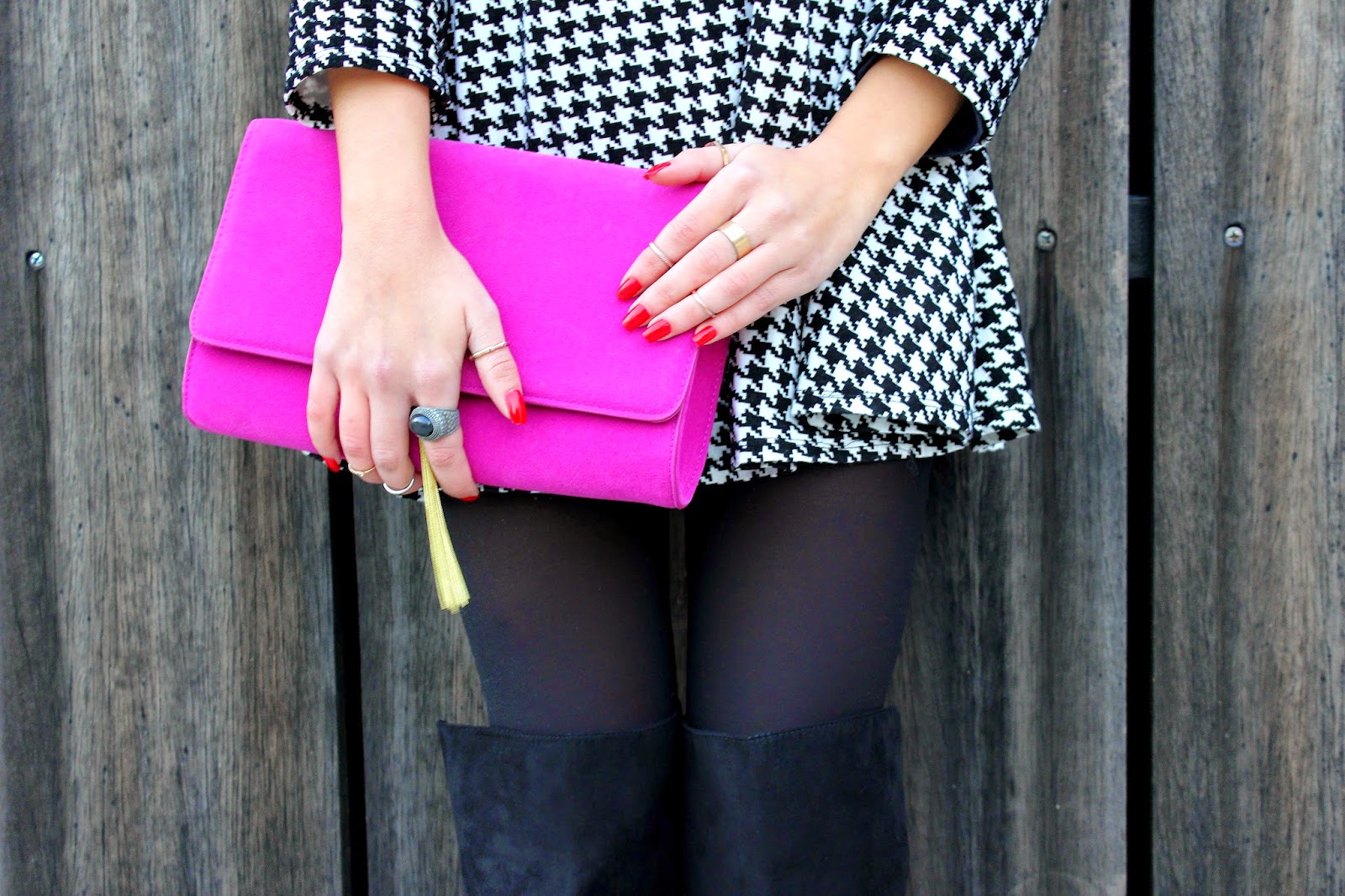 For my beloved fashion companion i have one sentence, "less is more" and no one better to show it than this girl, and A line short dress with some "piet de poule" pattern to stand out, no jewelry, a color blocking pink handbag contrasting with the black & white, some circle sunglasses, and the most outstanding chic piece, which i love, the high knee boots, praise lord of shoes this girl is working it, no platform, thin heel with the perfect measure to give some height, and that detail on the back of the leg, is just drop dead gorgeous, definitely two thumbs up for this look loved it.